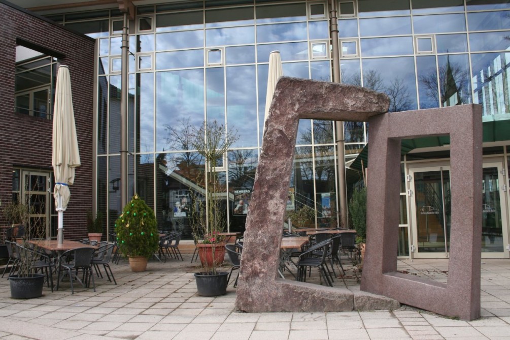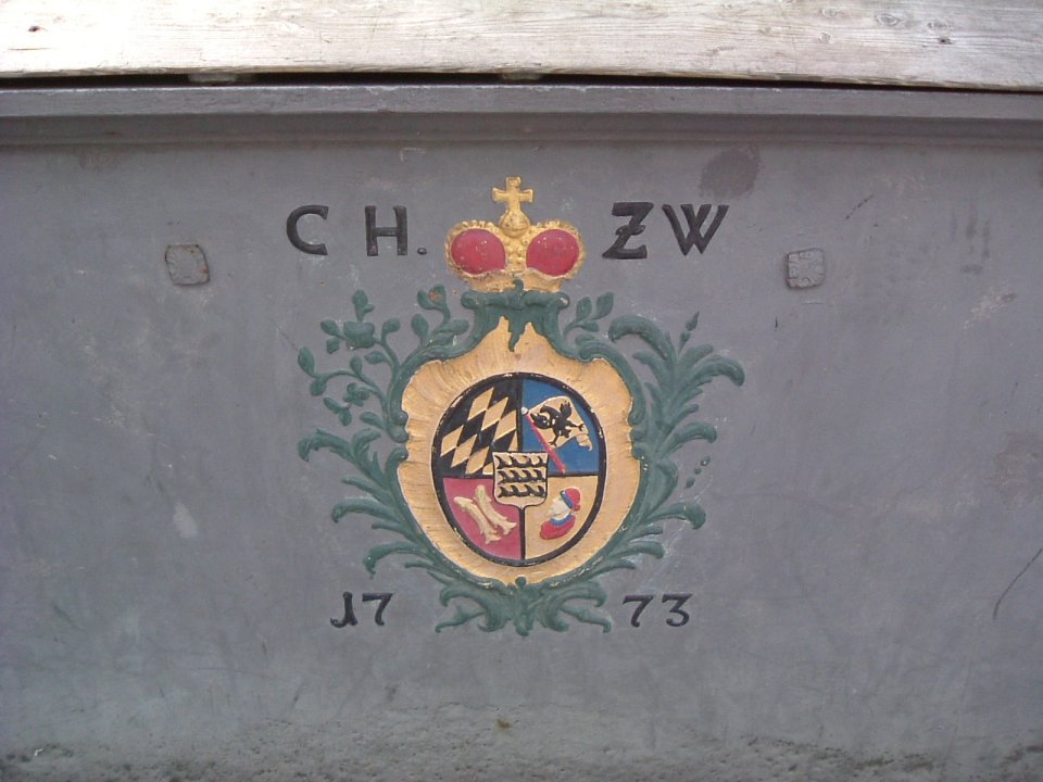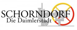 Ein älteres Stadtlogo weist auf den Erfinder des schnellaufenden Benzinmotors