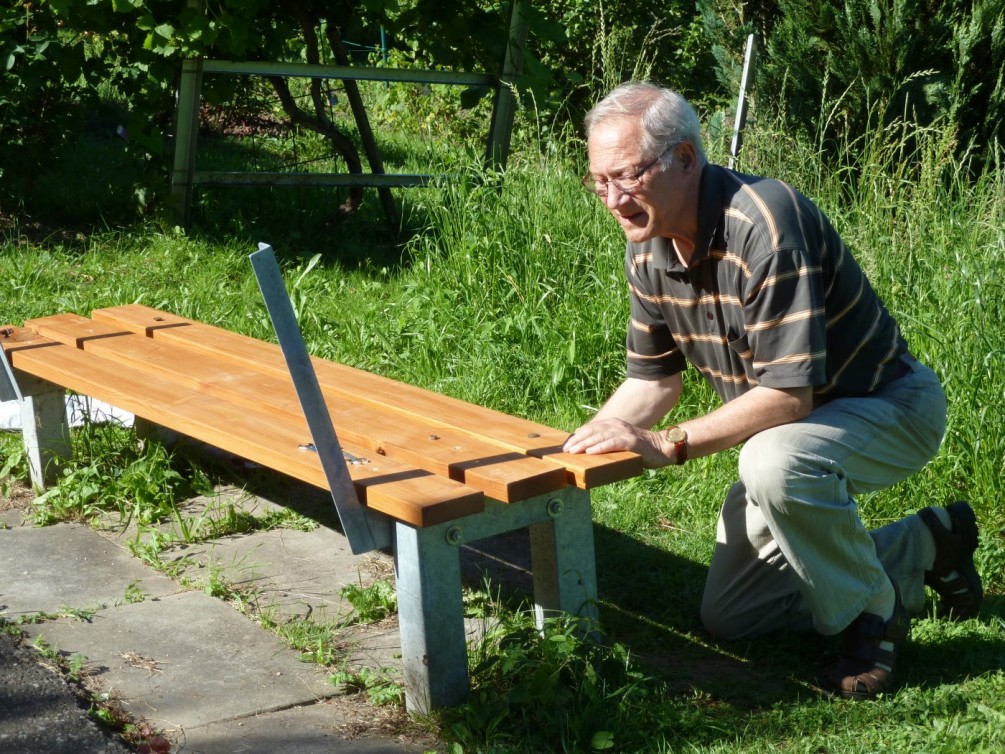 Volker Gaiser brachte unsere Jubiläumsbank im Gewann „Steinmäurich“ wieder auf Vordermann. Den Namenszug in die Rückenlehne hat Wolfgang Ehmann geschnitzt.