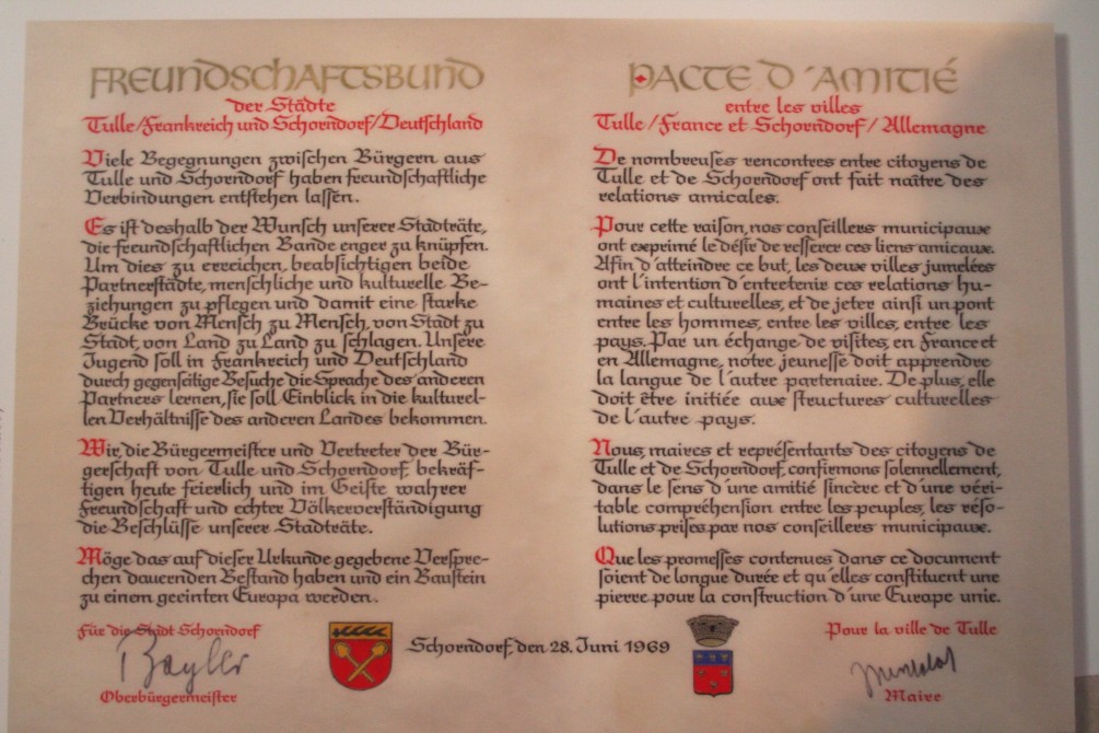 Mit großem Enthusiasmus und Stolz zeigten uns die Tullisten ihre schöne Heimat, brachten uns bei Volkstanzfesten mit anderen Gruppen zusammen. So entwickelte sich ein Gemeinschaftssinn, der für eine solide Grundlage eines paneuropäischen Gedankens unbedingt erforderlich ist. Bei einem Empfang auf dem Rathaus in Tulle wurde dann der Gedanke einer Städtepartnerschaft direkt angesprochen und wir bekamen die ehrenvolle Aufgabe, für diesen Gedanken in Schorndorf zu werben. Unsere Begeisterung konnten wir leicht auf Stadtverwaltung und den Stadtrat von Schorndorf übertragen, ja es wurde mit viel Beifall aufgenommen, dass die Wurzeln solch einer Partnerschaft in der Bevölkerung und nicht in der Administration liegen würden. Rasch hatten auch andere Schorndorfer Vereine und Organisationen Kontakte nach Tulle hergestellt und so konnten bereits 1969 die Urkunden in Schorndorf und 1972 in Tulle unterzeichnet werden.